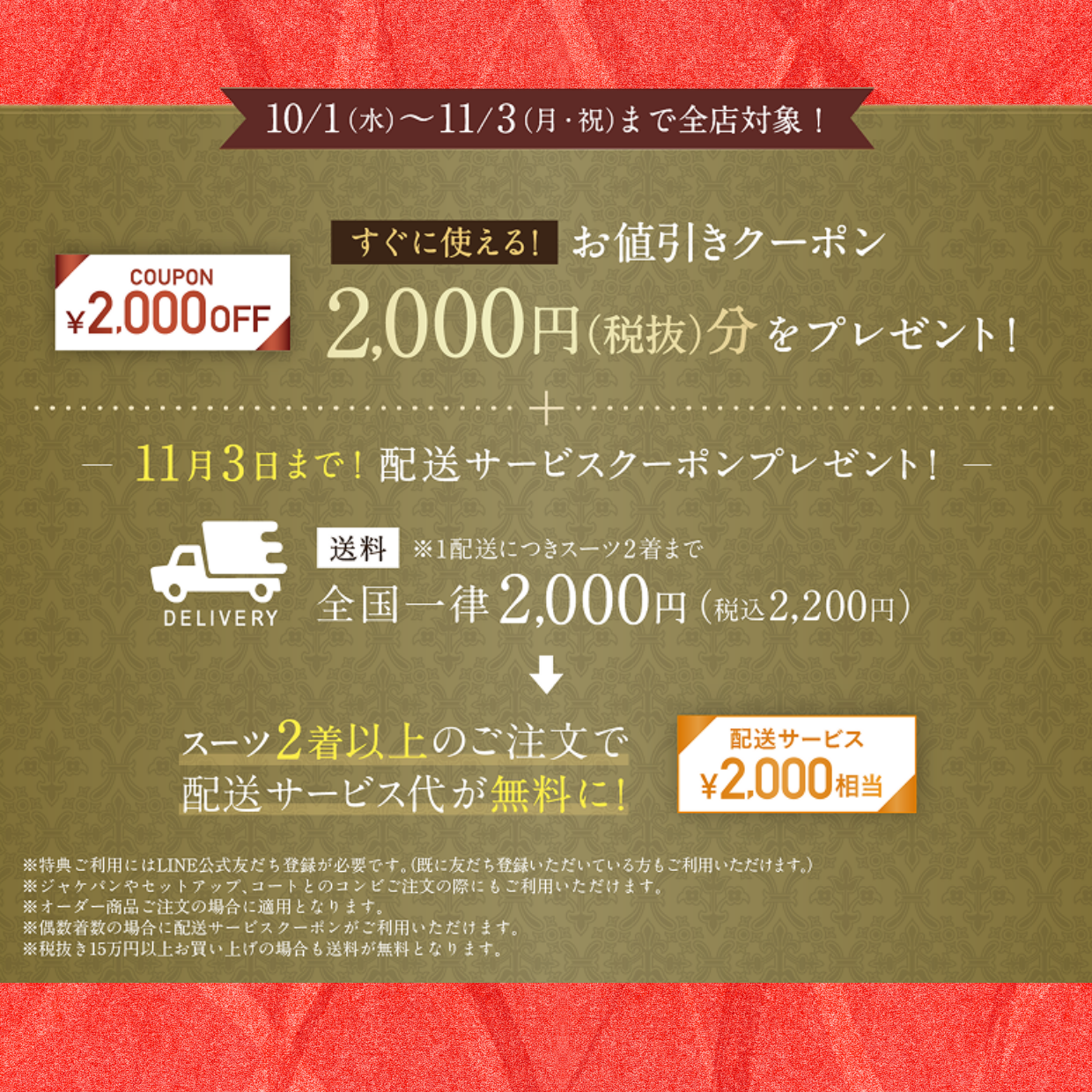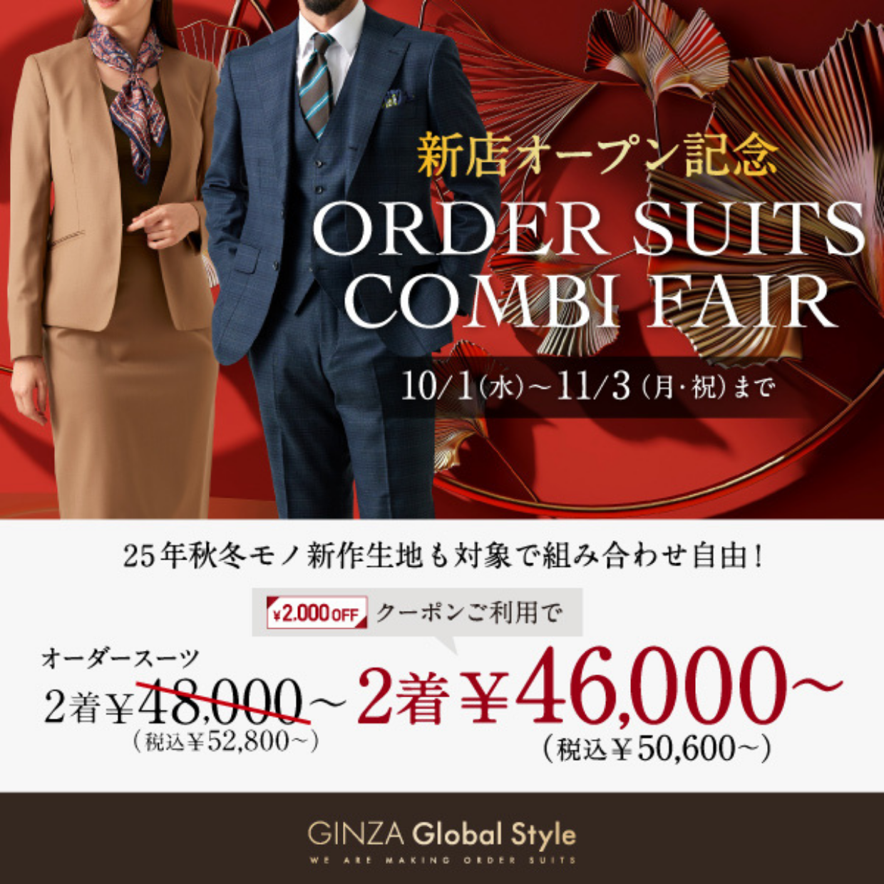 The custom-made suit fair, where you can choose from approximately 5,000 types of fabric, including new arrivals and fall/winter items, the largest in the industry, is being held until November 3rd (Monday, national holiday)!