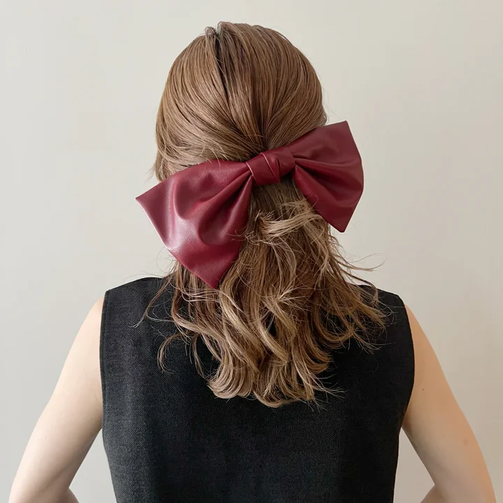 Soft-touch vegan leather is hand-gathered to create a bold big bow.