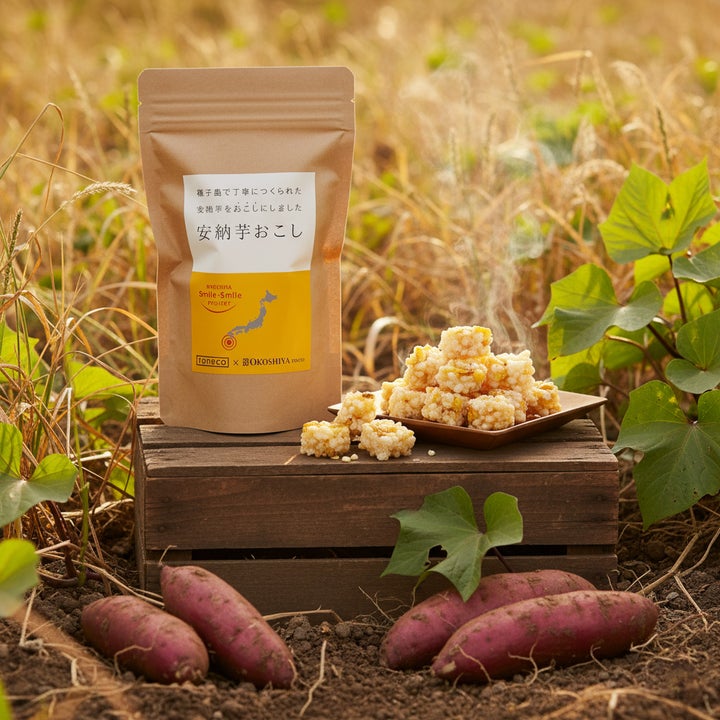 The first product in this project, "Annou Imo Okoshi," is a collaborative product between us, "OKOSHIYA," and "taneco," a brand that sells products made with Annou sweet potatoes from Tanegashima.