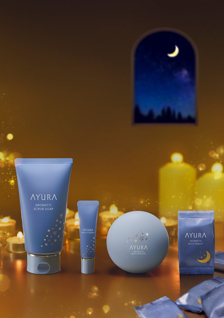 The three products are exclusive to this coffret: "Aromatic Scrub Soap," which gently removes rough skin and cleanses it with beauty foam; "Aromatic Bath Tablets," a bath additive that relaxes the mind and body before bed; and "Aromatic Body Mousse," which has a whipped cream-like texture and melts into the skin. The "Night Lip Essence" has a special design exclusive to this coffret.