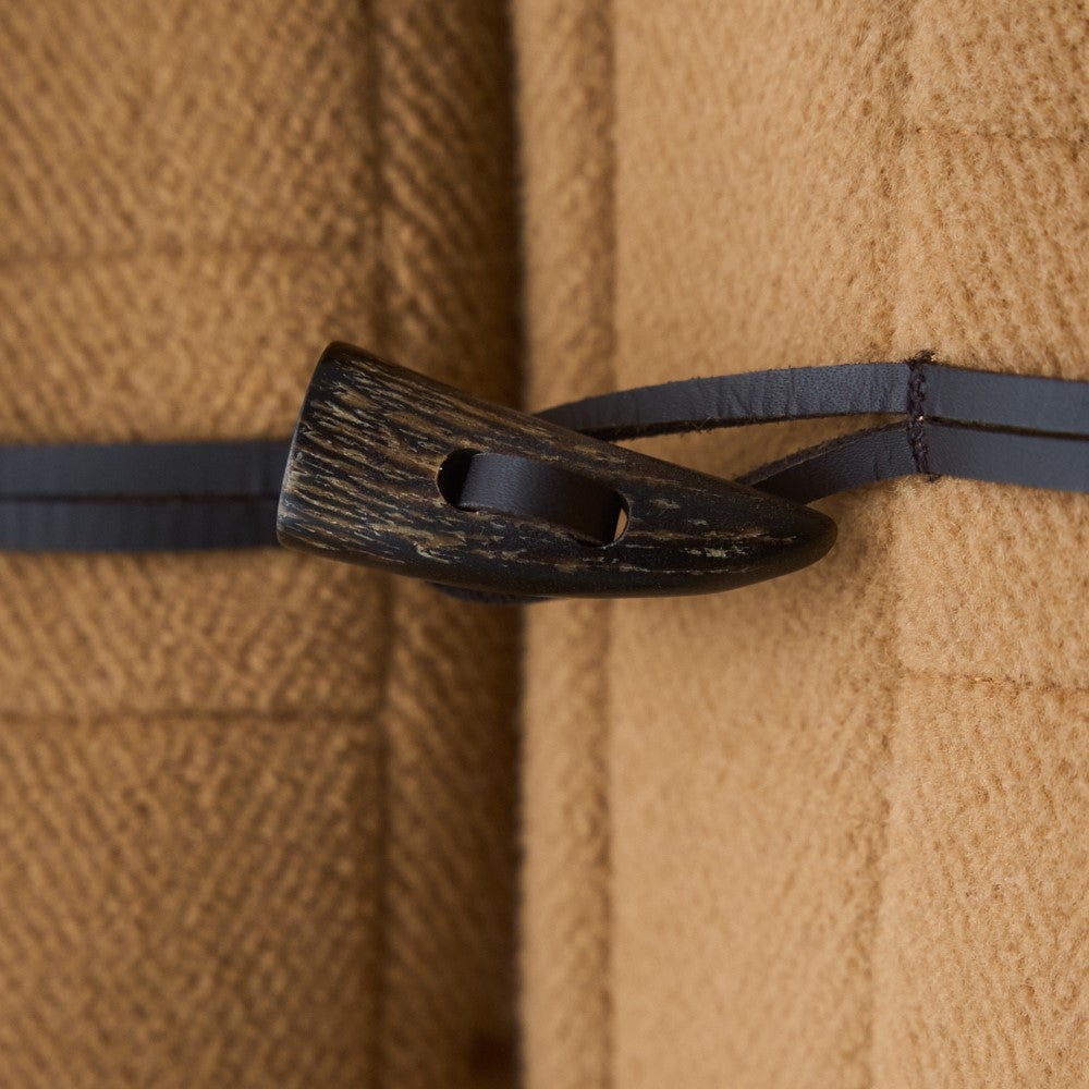 The distinctive details of the Glenmore duffle coat are the horn toggles made from water buffalo horn and the leather loops. This contrasts nicely with the casual impression of the naval design, which uses wooden toggles and hemp cord. The luxurious appearance exudes the elegance befitting a "gentleman's duffle coat."