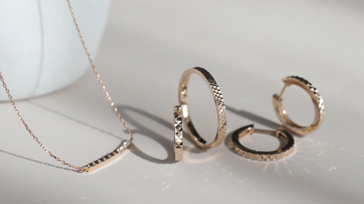 We also offer earrings and ear cuffs that will add a touch of glamour to your ears, matching the mirror-cut necklaces and rings that reflect light and create a sparkling look.