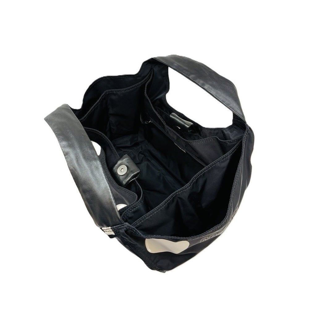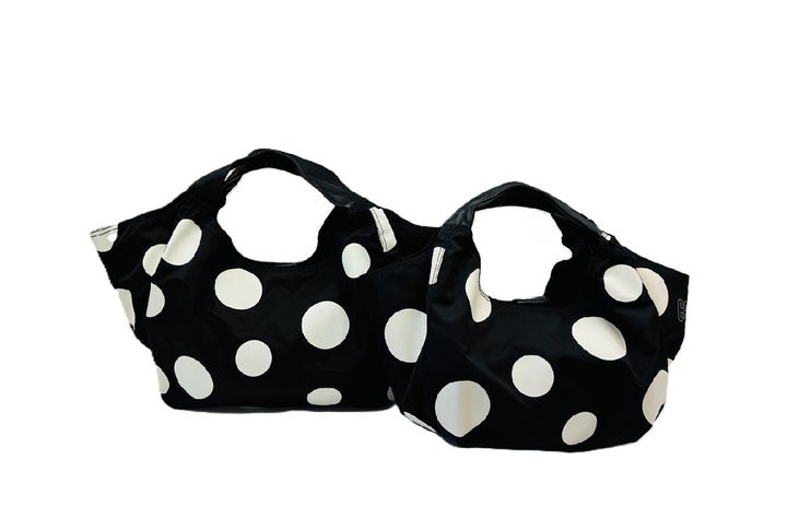 This bag features bold white dots on a black background. It is highly functional with gusset pockets and hanging pockets, the shoulder strap is made of soft sheep leather, and the opening of the main body has a magnet.
