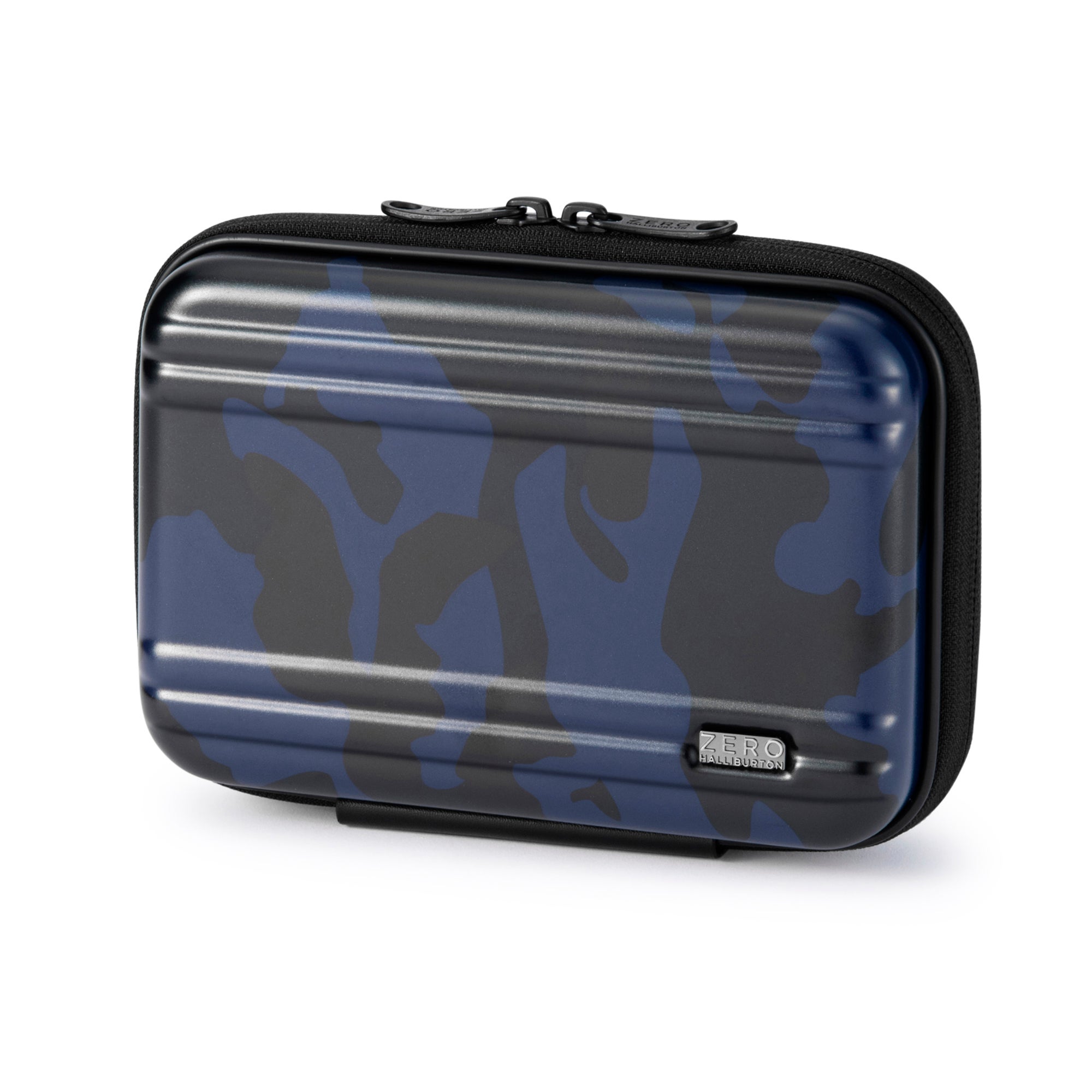 The "ZERO HALLIBURTON" logo is placed in the center of the front, and the expandable material conforms to the shape of the suitcase. - Amenity case