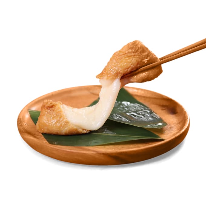 店内つきたてのお餅を使用した新感覚のいなり寿司。常温でもちもち、温めなおして伸びーる食感を楽しんで。