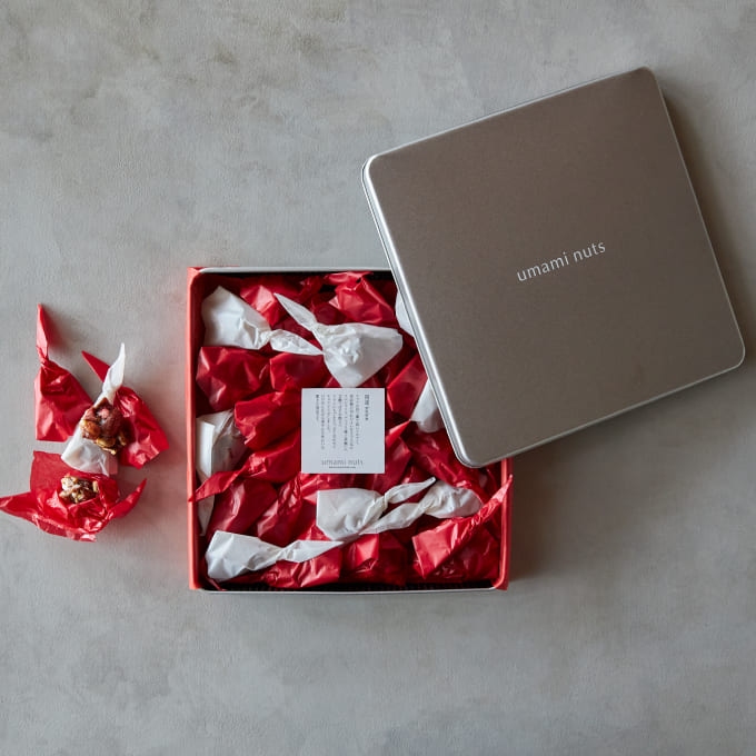 黒糖でキャラメリゼしたアーモンド、カシューナッツ、ピスタチオに甘酸っぱいドライいちごをトッピング。赤と白の包み紙も縁起が良く華やか。