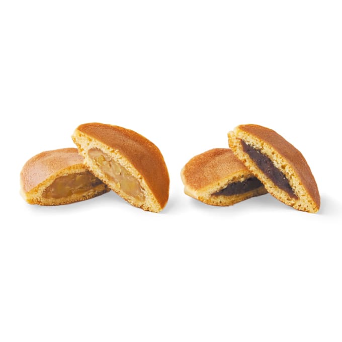 丹波大納言小豆の粒あんと和栗・備中白小豆の上品な栗あん各6個入り。国産米粉でしっとりもちもちに焼き上げたグルテンフリーのどら焼き。