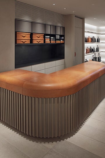 丸の内店で私が好きなところは、革張りのカウンターです。自社の職人が仕立てたものなのですが、一枚革をシワなく張っておりとても美しいです。オープン時からエイジングも進み、色がどんどん濃くなっていることも好きなところです。