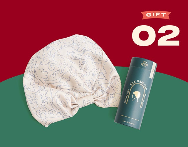 「被るだけで睡眠中の摩擦ダメージや乾燥から髪を守ってくれるシルクヘアキャップ。最高品質のシルク100%で、洗練されたデザインなので、ギフトにも喜ばれること間違いなしです!」