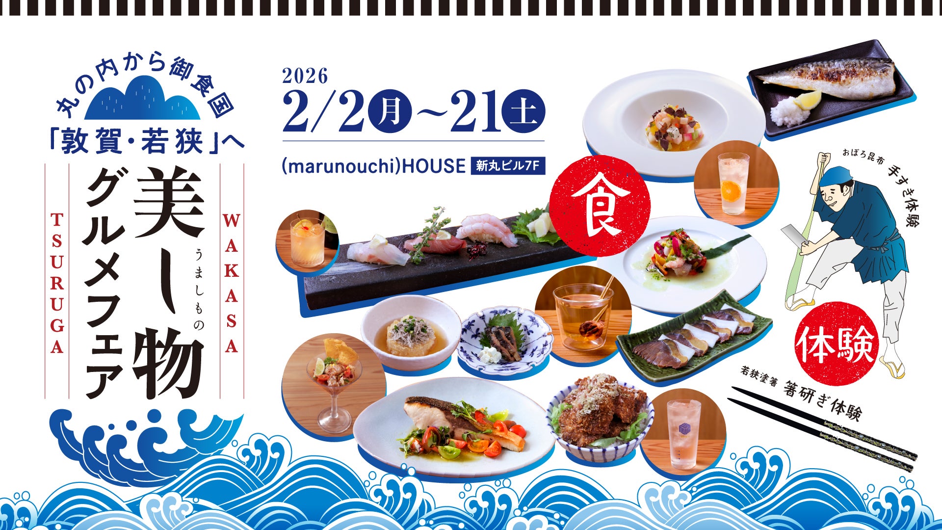 2月14日(土)と15日(日)には敦賀が生産数日本一を誇るおぼろ昆布の手すき体験、2月20日(金)と21日(土)には貝殻や卵柄をのせ色とりどりの色漆を何度も塗重ねてできる若狭塗箸の箸研ぎ体験など、敦賀・若狭地域を代表する食と工芸品のワークショップを実施します。地域の食材がもつ上質さや伝統工芸の魅力をこの機会にぜひ体験してください。さらに、2月20日(金)と21日(土)には敦賀のご当地ヒーロー「双蝶のギョーブ」が丸の内ハウスライブラリーに登場し、グリーティングを行います。