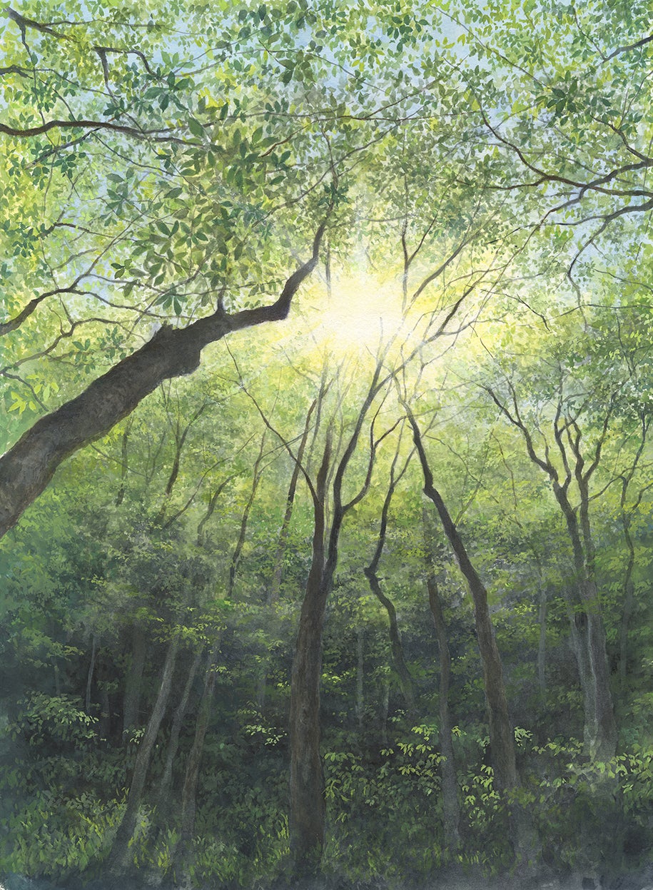 画像:「奥入瀬の木漏れ日」水彩、ガッシュ