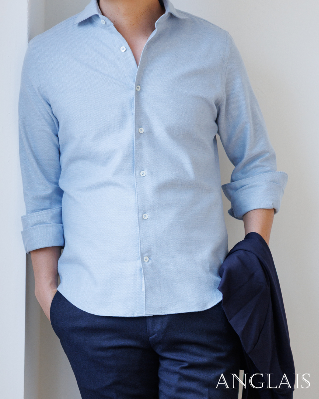 短めの着丈に自然なゆとりを持たせたシルエット、そしてセミワイドカラーの端正な襟元。