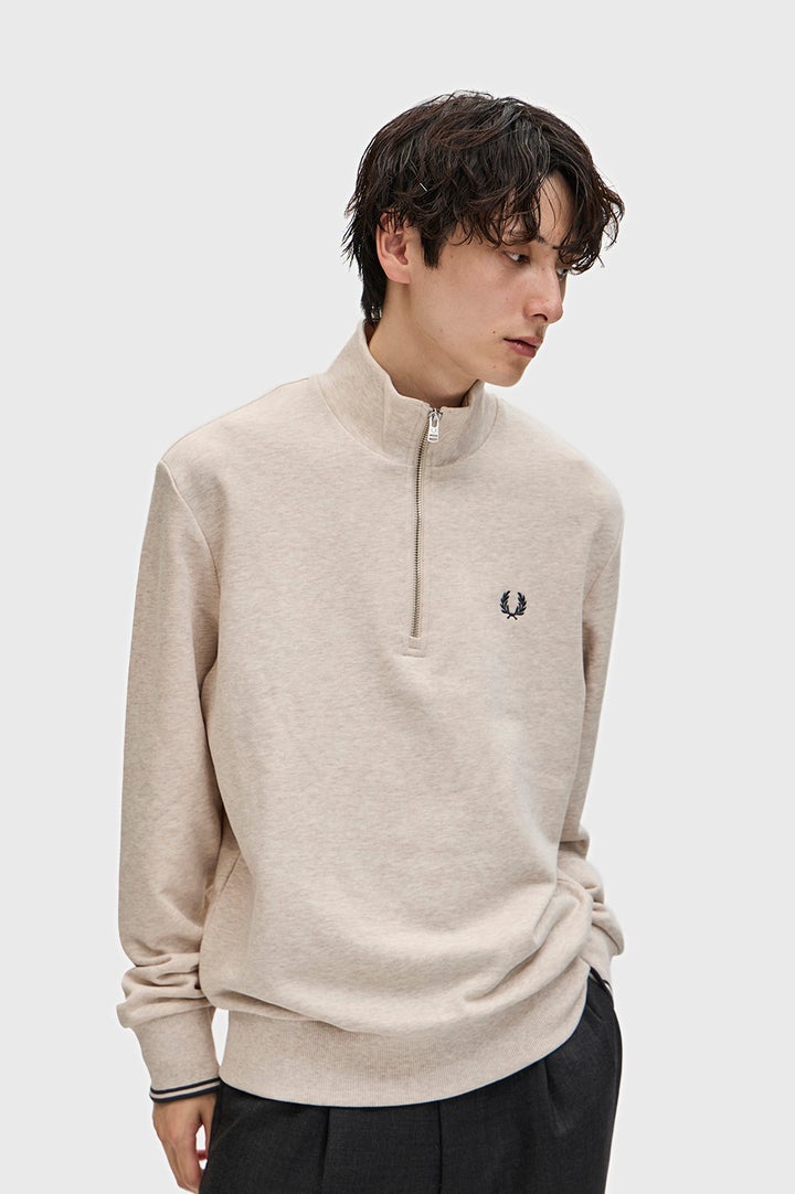 ハーフジップデザインのスウェットシャツ。クリーンできれいな表面感があり手触りがソフトな裏毛スウェット素材を使用しています。プレーンなボディに袖口のティップラインがアクセントになっています。