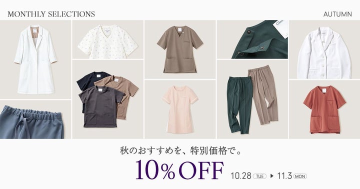 深まる秋に似合う白衣・スクラブを7日間限定で10%OFFにてご提供いたします。