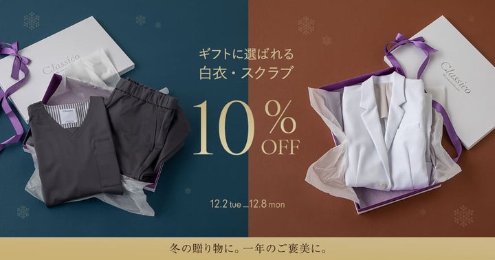 12月2日(火) ~ 12月8日(月)の7日間限定で、ギフトに選ばれるスクラブ&白衣を10%OFFにてご提供します。