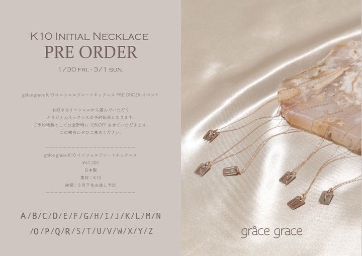 大人気のオリジナルアクセサリーブランド「grâce grace (グラスグラス)」から10Kイニシャルプレートネックレスオーダーフェアを期間限定1月30日(金) ~ 3月1日(日)で開催。