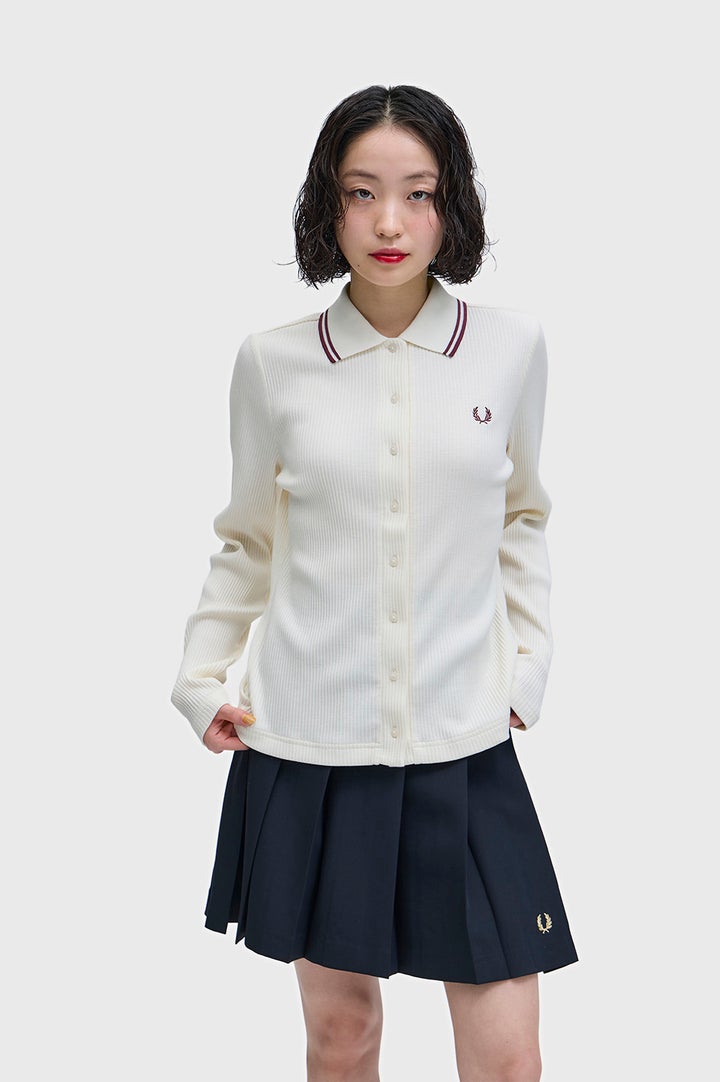 コットンポリエステルリブの長袖ポロシャツ。襟にシグニチャーのツインティッピングを施しました。羽織としても使えるフルオープンの仕様が特徴です。