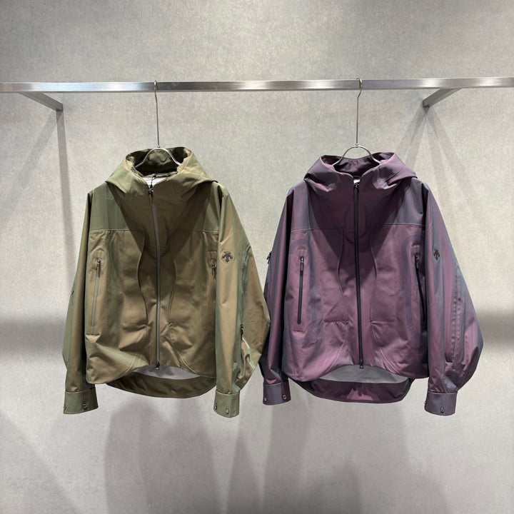 優れた耐水性と透湿性を備えつつ、着用して動きが加わることで生地の表情が変化する、奥行きのある色合いが特徴的。全体的にショートレングスかつ、身幅と袖にボリュームを持たせることで、空気が衣服内を移動しやすい丸みのある立体的なシルエットに設計。
