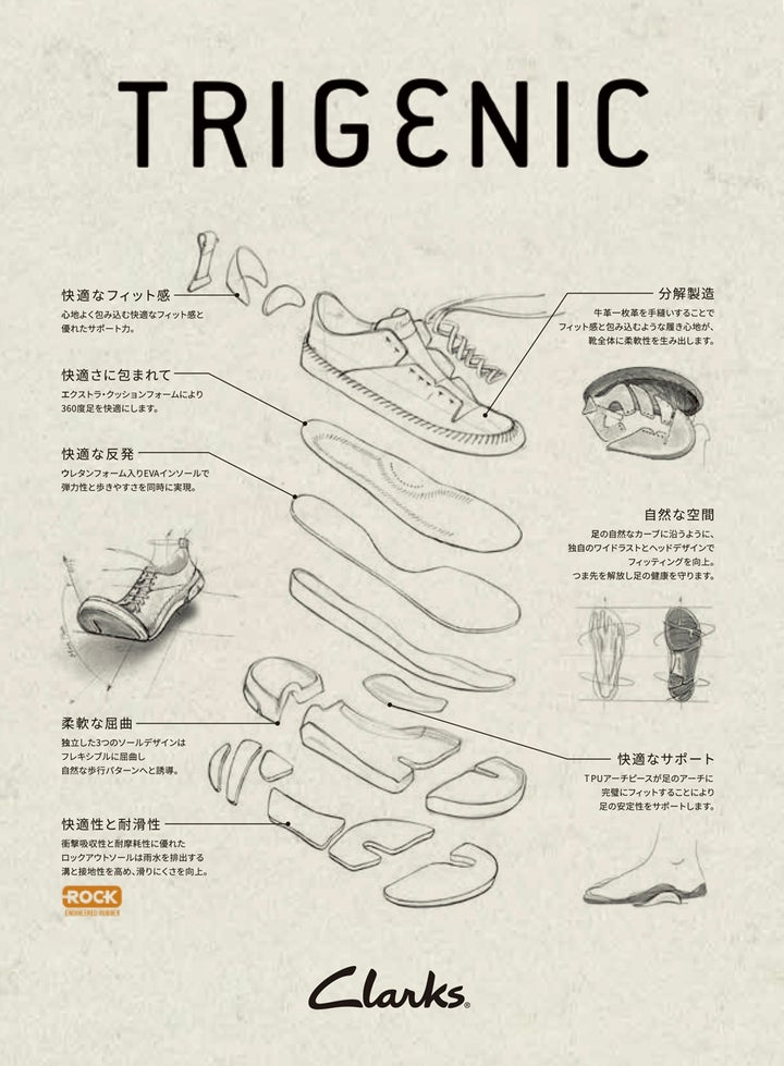 クラークスのアーカイブコレクションからTrigenic(トライジェニック)シリーズが復刻。足の形状に合わせ、切れ込みが入った3つの分離ソールが、足の自然なカーブとスムーズな歩行を促すクラークス独自の仕様になっている。