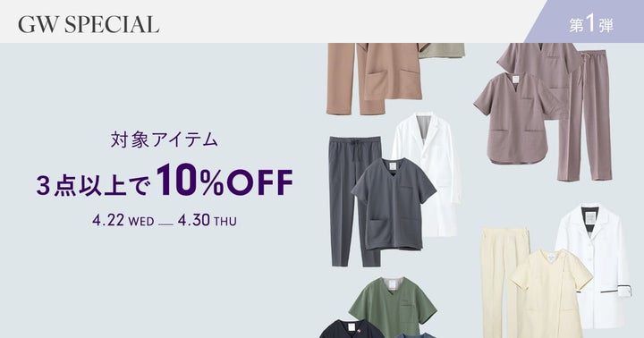 白衣とスクラブ、同じ商品の色違いなど、対象品同士の組み合わせは自由。