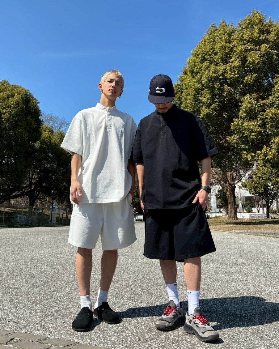 同色展開のショーツとのセットアップスタイルは、この春夏おすすめのクールな装いです。