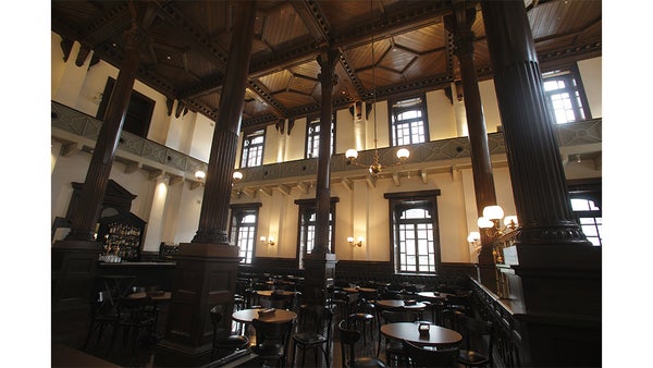 明治期に銀行営業室として使われていた空間を復元した、二層吹き抜けの開放感あるフロアが印象的なカフェバー。アルコールメニューも充実しているので、夜もお楽しみいただけます。パーティー利用や貸切利用も可能です。
