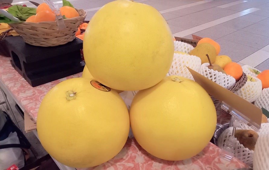 熊本县八代市特产“晚白柚”是柑橘类的柚子中的一种,以个头特别大而闻名。直径约为20~25厘米,重量为1.5~2.5千克。