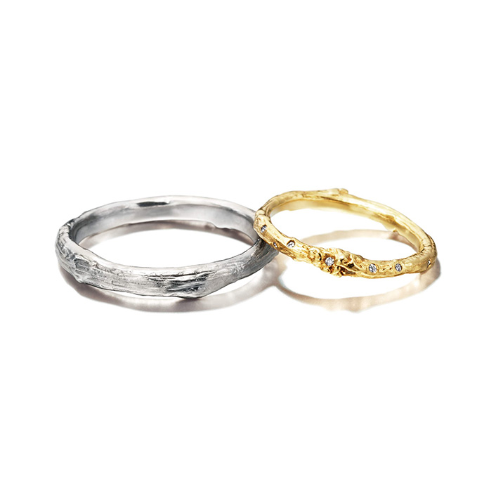 以古老的神木木片為形象的戒指為基礎,在兩側添加了象徵永恆的米粒戒指,是一款三位一體的結婚戒指。不同質地交織而成的對比,給人以優雅的華麗感。