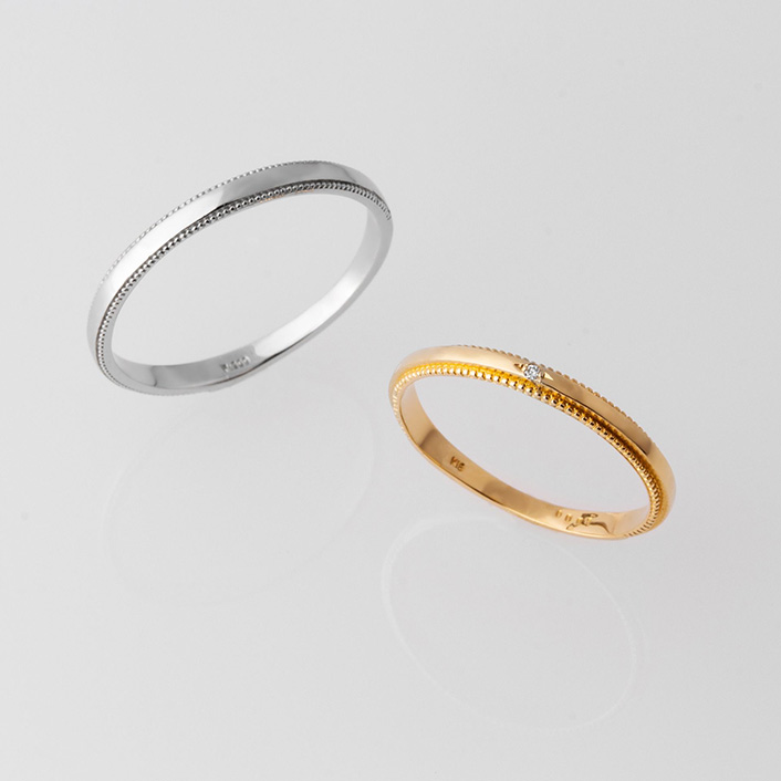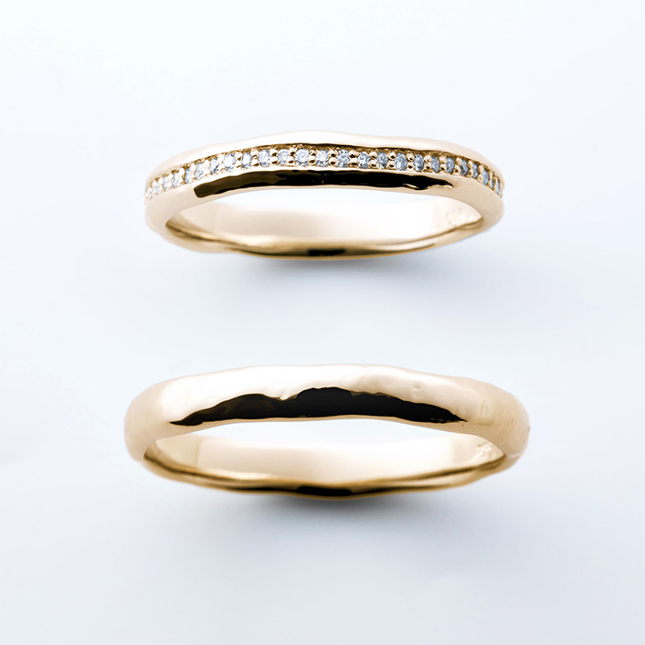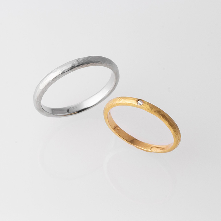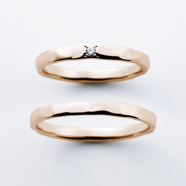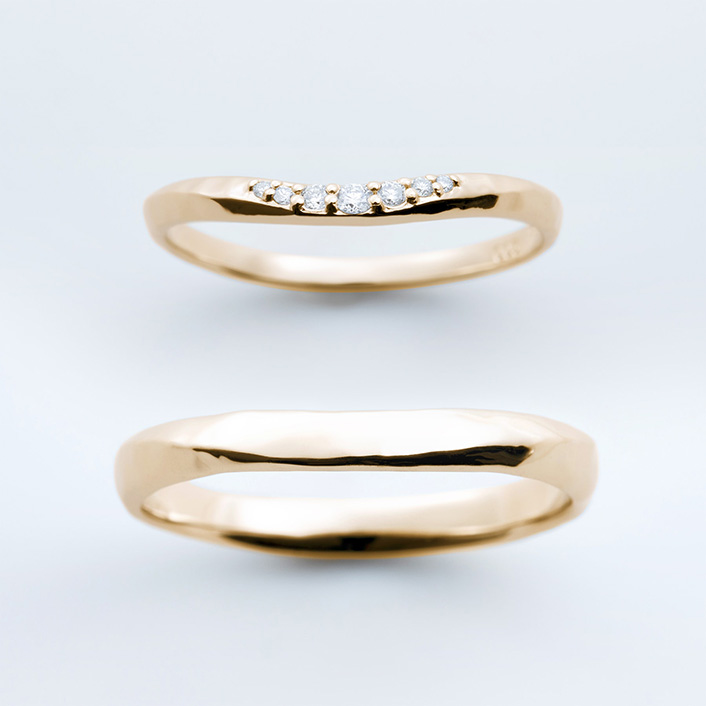 這款結婚戒指採用了敲擊的紋理,您可以享受光的反射和微妙的差別。柔和的曲線讓您的手更顯俐落美麗。