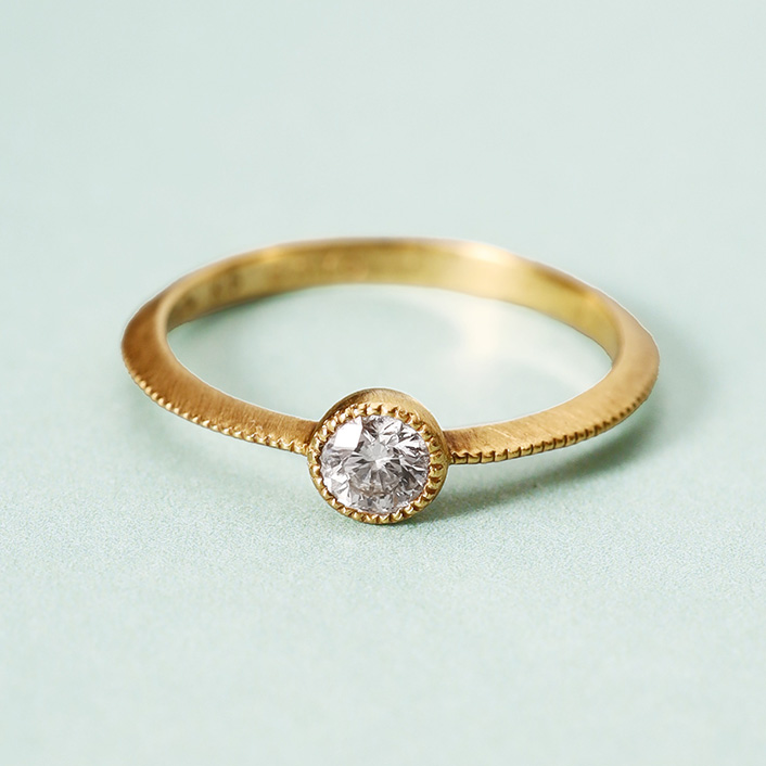 這款復古風的鑲圈訂婚戒指在保留了恰到好處光澤的質地上進行了米粒加工。這款設計的靈感來自於希望您能經常佩戴向往已久的鉆石。