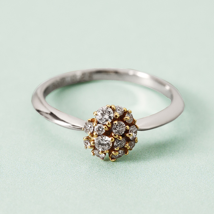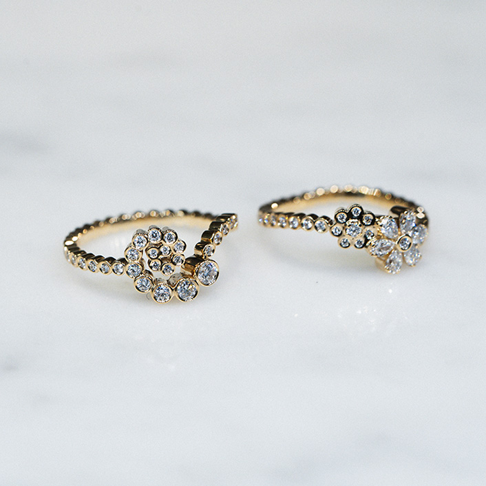 這款訂婚戒指給人一種精緻純淨的感覺,宛如一束滿天星,象徵著「幸福」和「珠寶」。它的配色也與時裝首飾完美搭配。